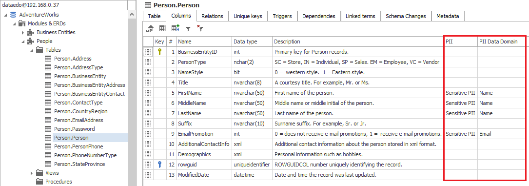 - Domain - Type/domain of data held in the column. Types include: name, email, phone number, date of birth, address, etc.