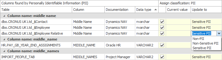 The list contains all the columns found that meet conditions defined above. Your task is to review them before you save classifications. It is advised to do so in packages. First remove selection with Select none option. Then go by column names and review labels.