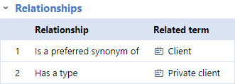 User can define relationships between terms. Each relationship has following attributes: