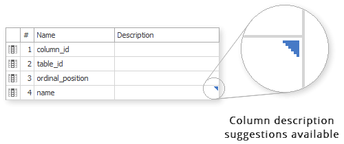 Dataedo suggests texts for column descriptions, titles or text custom fields based on texts from other columns.