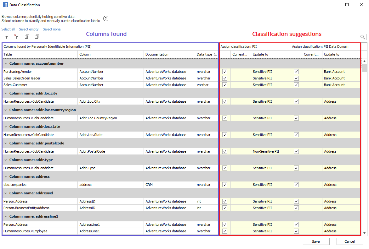 Dataedo 7.5 Enterprise has a convenient automated data discovery and classification functionality with built in predefined functions for PII and GDPR that scans entire repository and suggests labels.