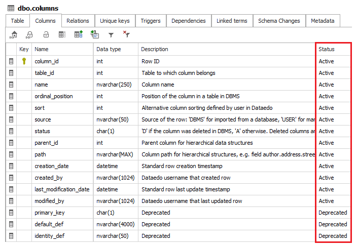 Databases hold many tables and columns that are not used anymore, were never used, or are not used yet. Probably, there are many other cases that you can think of. Understanding the status of the field might be crucial and helpful when working with database and data. We advise documenting the status in a custom status field.
