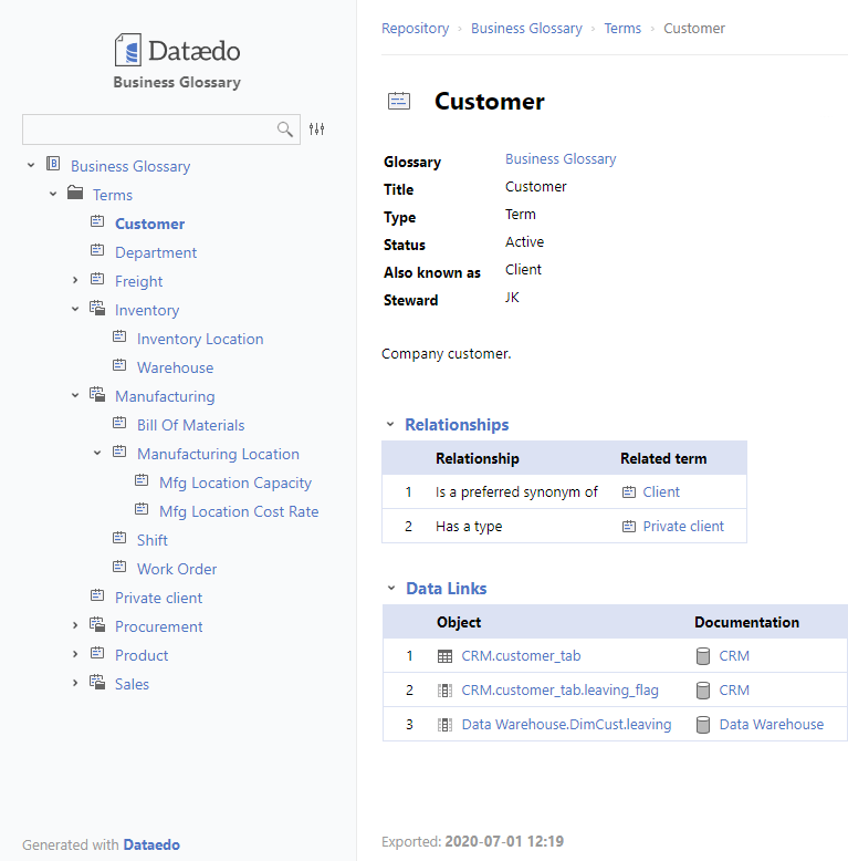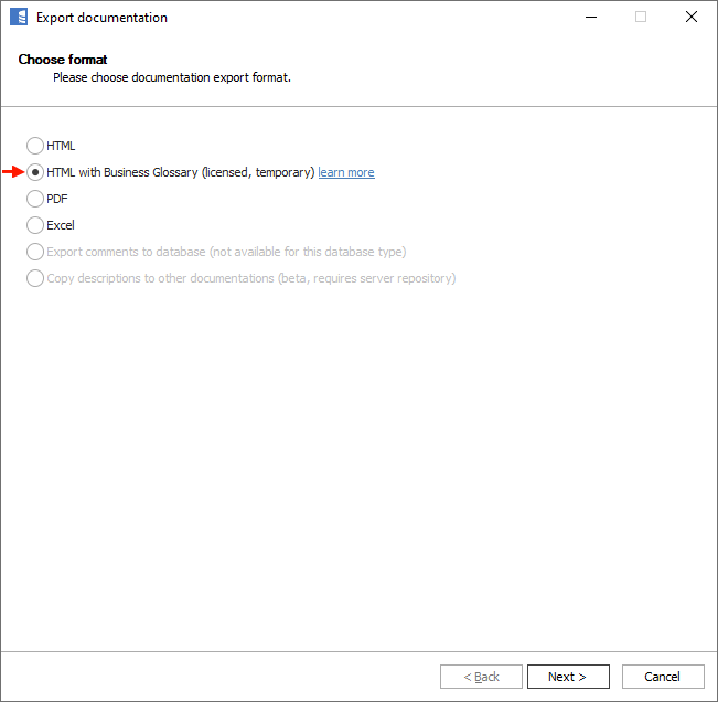 Business Glossary can also be shared in HTML documentation. HTML with Business Glossary is a separate export option and works just as regular HTML export, except it also includes business glossaries.