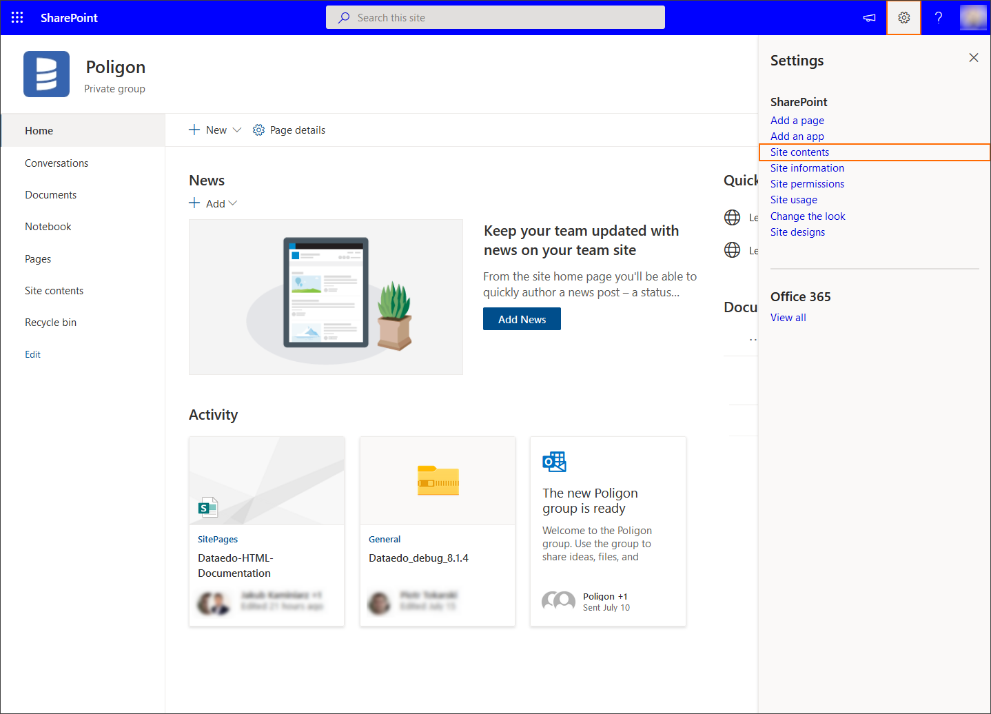 To do so, open Sharepoint Site, click the cogwheel in the top right and click Site Contents.