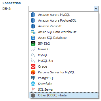 There are native connectos to specific database technologies (such as Microsoft SQL Server, Oracle) and generic connectors that can be used to connect to any technology with an external driver (ODBC).