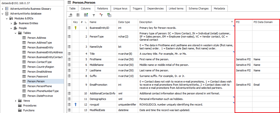 Dataedo helps you comply with data protection regulations by finding and tagging fields holding sensitive data. It supports multiple parallel classifications, each for different purpose/regulation. It includes two built-in functions: PII and GDPR.