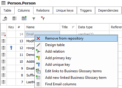 Main data asset in the repository is table. Table represents tables in the relational databases or analogous object in other data technologies. Tables consist of columns. Each column has a name, data type, nullability, default value, calculation formula.