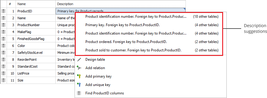 Dataedo helps you with documentation efforts by suggesting text from descriptions from other columns.