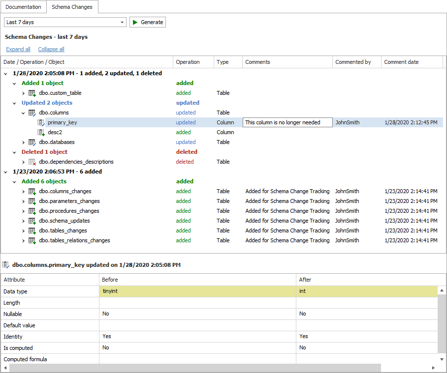 When Schema Change Tracking mode is enabled in the repository then each change imported from the source is logged in separate metadata structures and accessible for analysis and documentation in dedicated reports.