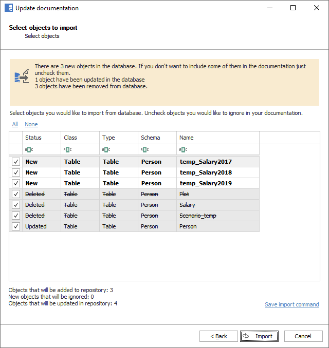 Important capability of Dataedo is the automatic maintenance of metadata in data catalog with smart Import changes functionality. This functionality connects to the data source, reads changes in the schema, and applies them to the catalog: