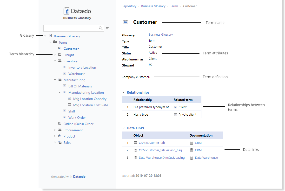 Data stewards can define extensive network of relationships between terms and other entries in the glossary.