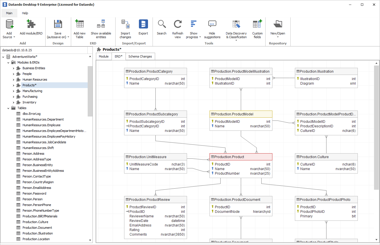 - Manual ER diagrams - available in Dataedo Desktop for Subject Areas/Modules, users choose which entities and columns are presented, and determine their location,
