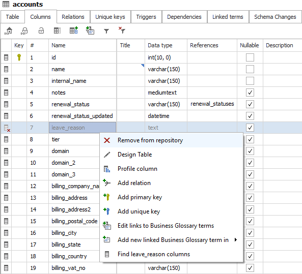 Similarly, to objects (table, views, etc.) also their elements (columns, keys, parameters, etc.) are marked deleted when missing in import. The idea is the same - copy the description and delete with Delete key or Remove from repository option in context menu (right click).