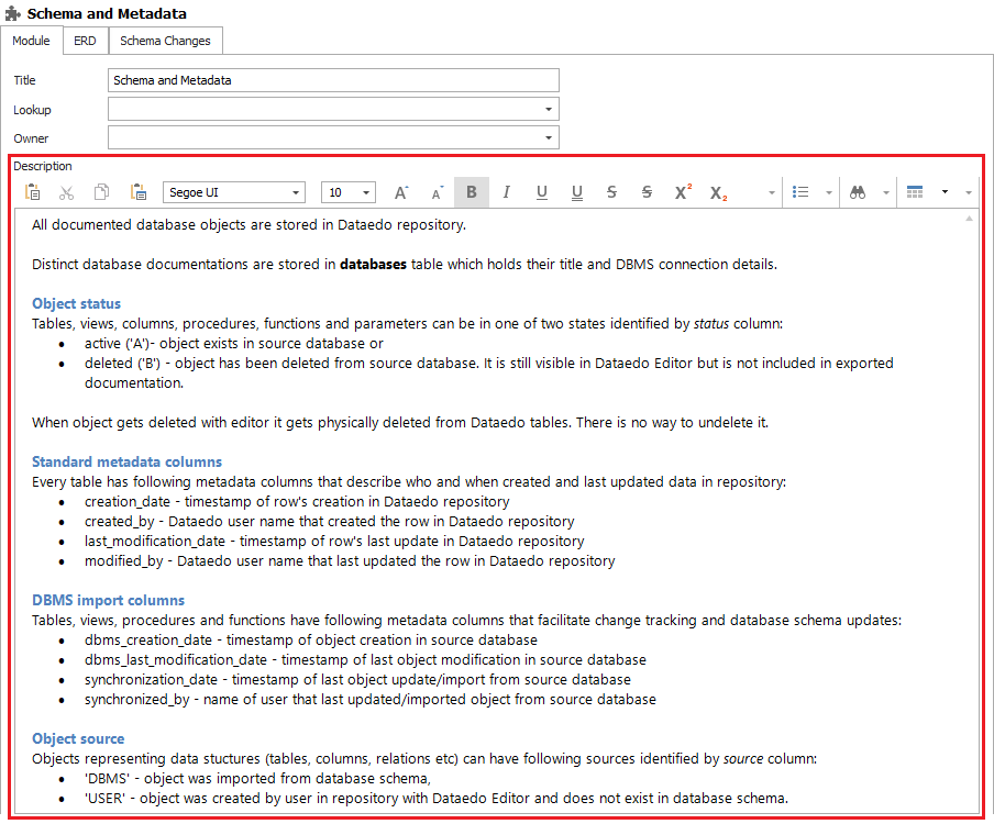 Every object in Dataedo repository has a description fields. There are two types of descriptions plain text and rich text.