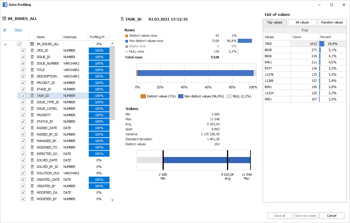 Data Profiling module allows you to look into the actual data stored in the tables and analyze how many null, empty, distinct values there are in each field, what are the min, max and average values and list most popular values. This information can be saved in the repository and is easily accessible in Web Catalog and Desktop, making it even easier for everyone to understand the tables and columns.