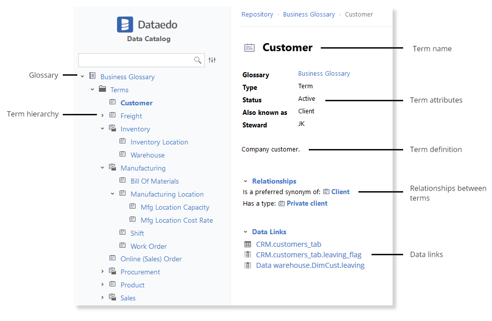 With a business glossary mapped to data dictionary your business can be more self-reliant and from navigate from business-oriented vocabulary to the physical data, otherwise accessible only to the tech-geeks who know the complicated structure of the databases.