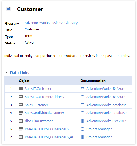Dataedo Business Glossary helps you build and share a universal vocabulary of business terms with their definitions and mapping to the data.
