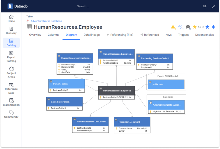 Discover and document relationships between data entities and visualize them with automatically built diagrams. Give everyone a better overview of related entities from any point in the catalog.