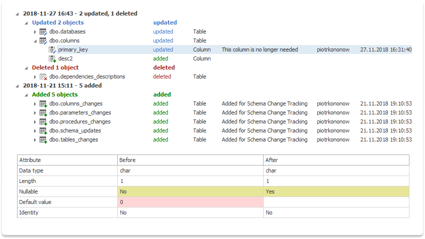 Dataedo scans schema of your databases and allows you to track, analyze and comment their changes.