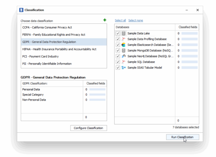 Scan your databases and find and tag fields holding personal data so you can know what data you are processing and where to comply with data protection regulations such as GDPR or CCPA.