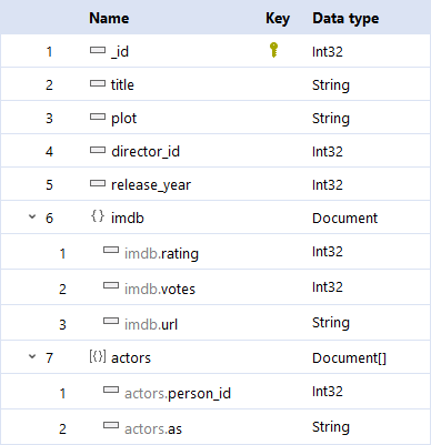 With a few clicks you can discover collections and document structures in your MongoDB database in a clear tabular view. Schema is discovered from sampling documents and MongoDB Schema Validation.