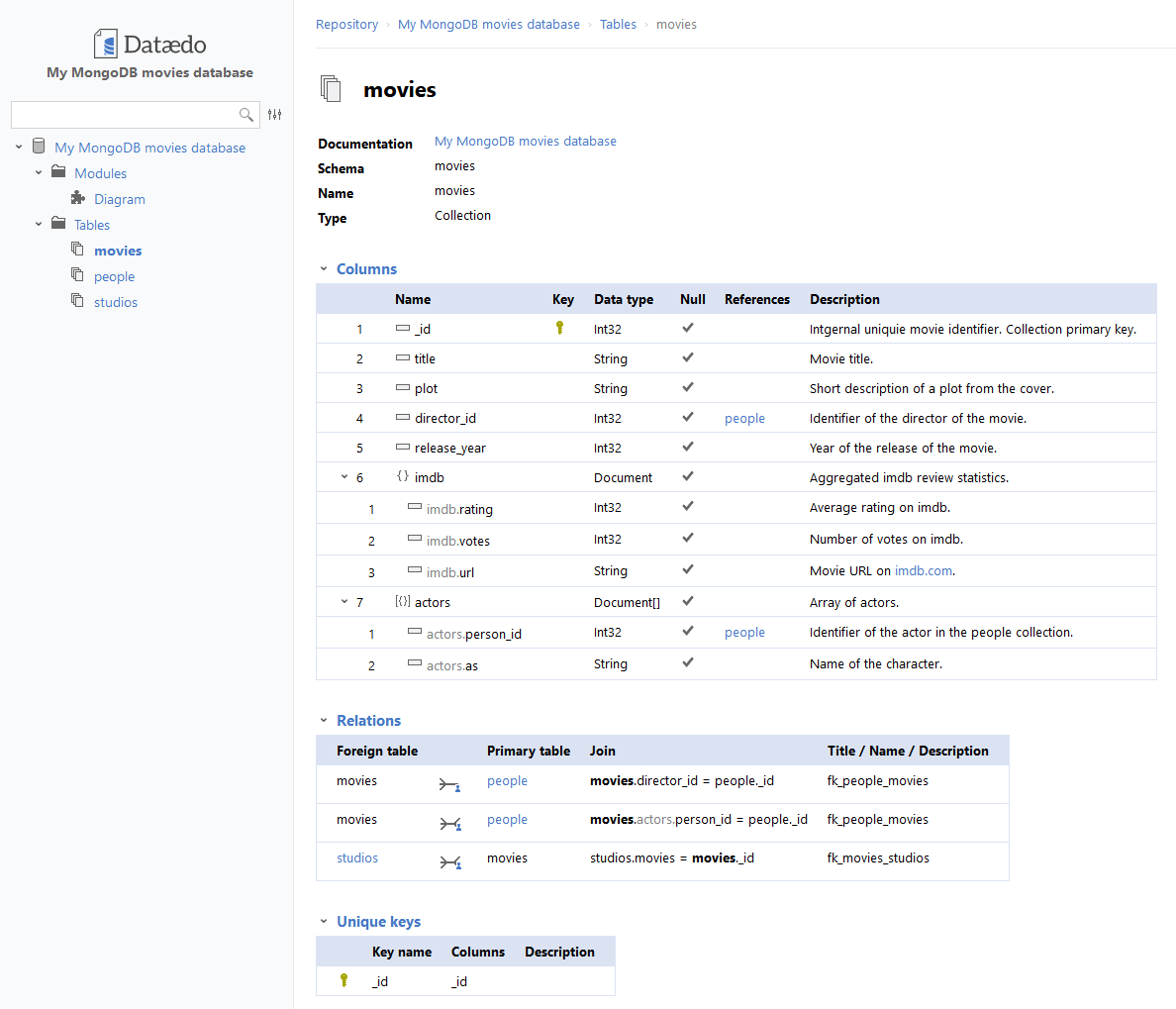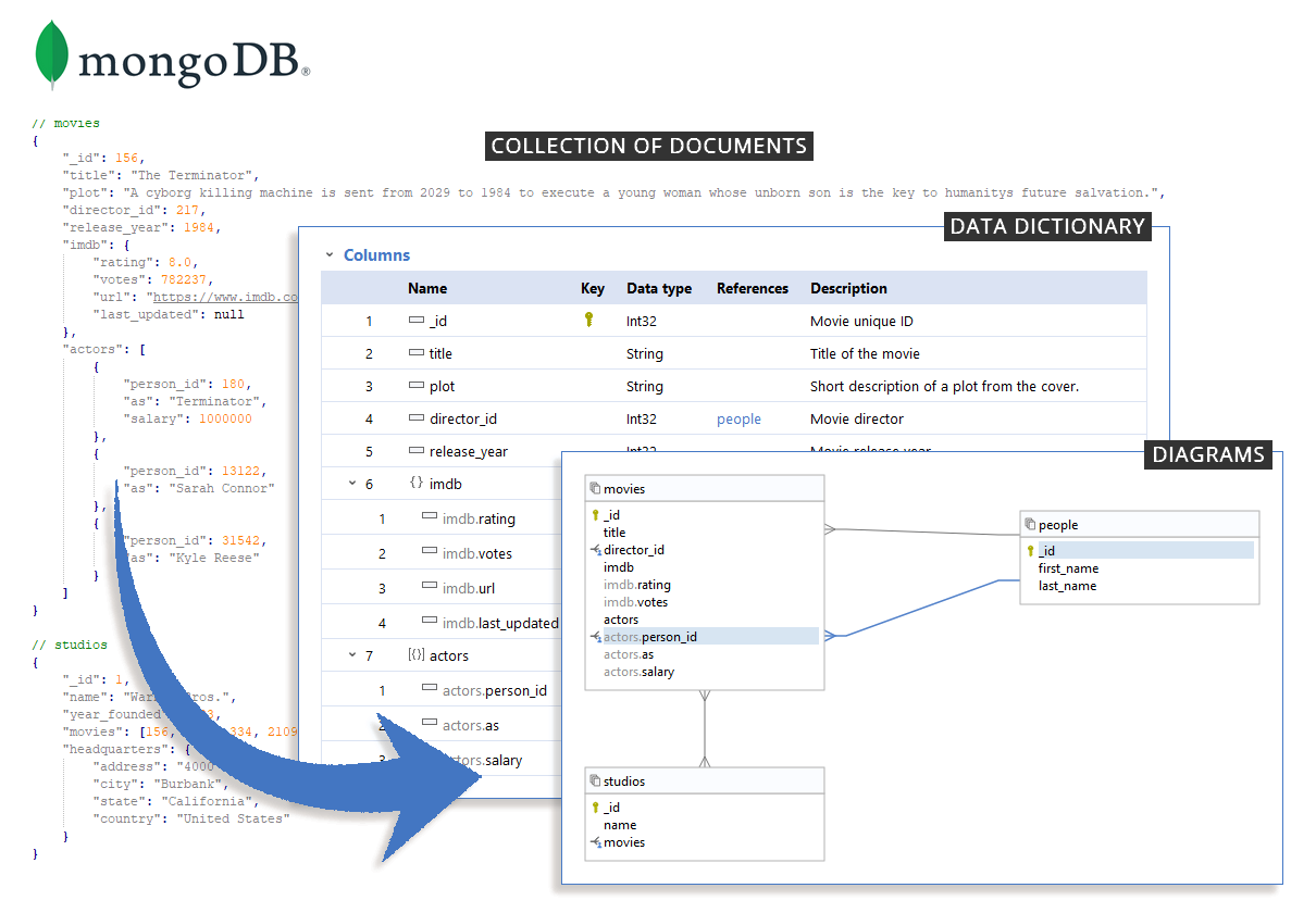 MongoDB allows for document references, much like foreign keys in relational databases. What it does not allow is the documentation of those relationships, so you just simply must know how it works. Dataedo allows you to capture that knowledge in structured form, visualize using diagrams, and share across entire organization.
