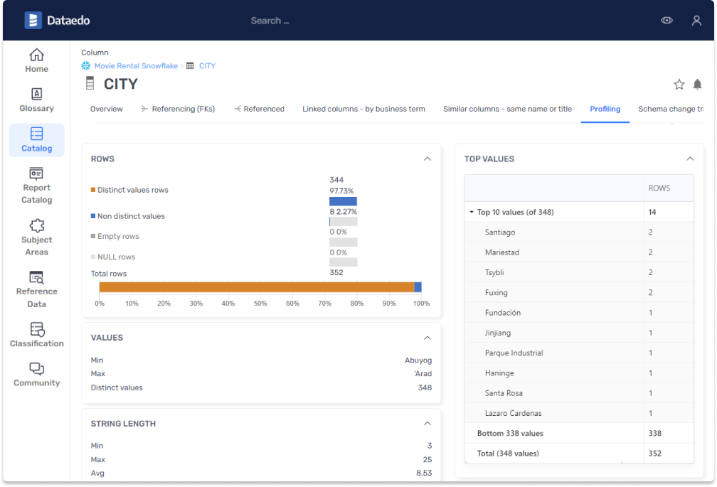 Use sample data to learn what data is stored in your data assets. Dataedo scans all values in selected tables and calculates useful metrics like rows number, percentage of distinct and empty rows. It also shows minimum and maximum values, average, median, span or deviation. This allows you to peak into values itself and identify areas that require improvements.