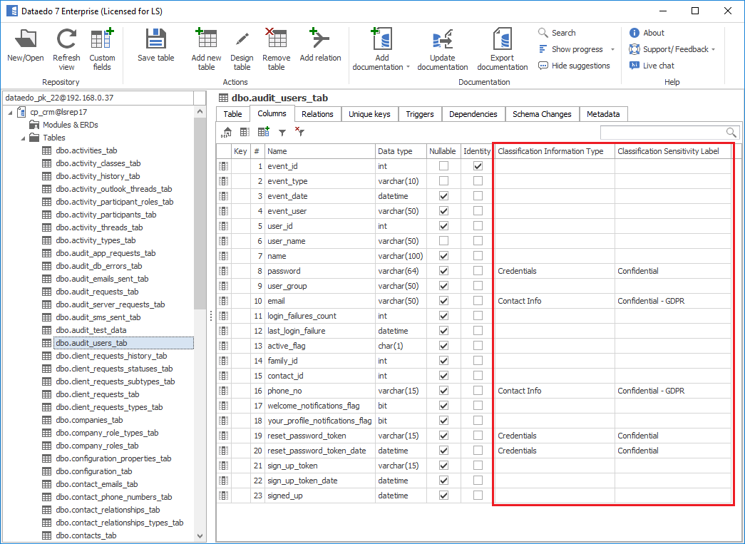 When you successfully imported data classification extended properties to Dataedo repository you can now see this metadata in new columns that will show on table columns form: