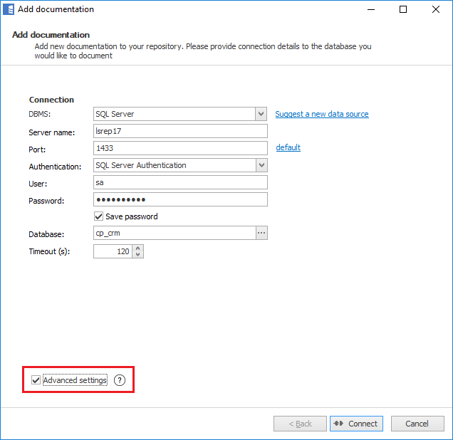 To import database to Dataedo repository click Add documentation button on the ribbon and provide connection details to your database. Make sure to check Advanced settings option.
