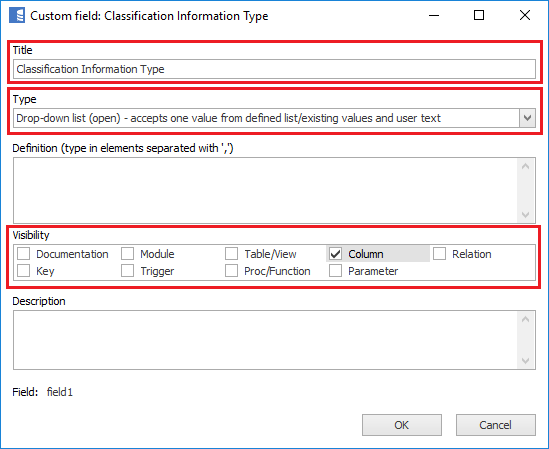 New window will open showing custom fields defined in Dataedo repository. If you don't have custom fields you'd like to import classification metadata into, you need to create new fields. I suggest two fields stored by SQL Server (you can choose different names):