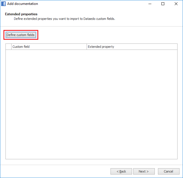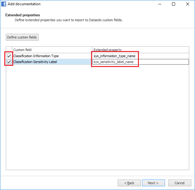 On the next screen (if you have selected Advanced settings option) you will see a list of custom fields defined in Dataedo repository. Most likely you will have to create new custom fields for SQL Server extended properties that hold classification data.