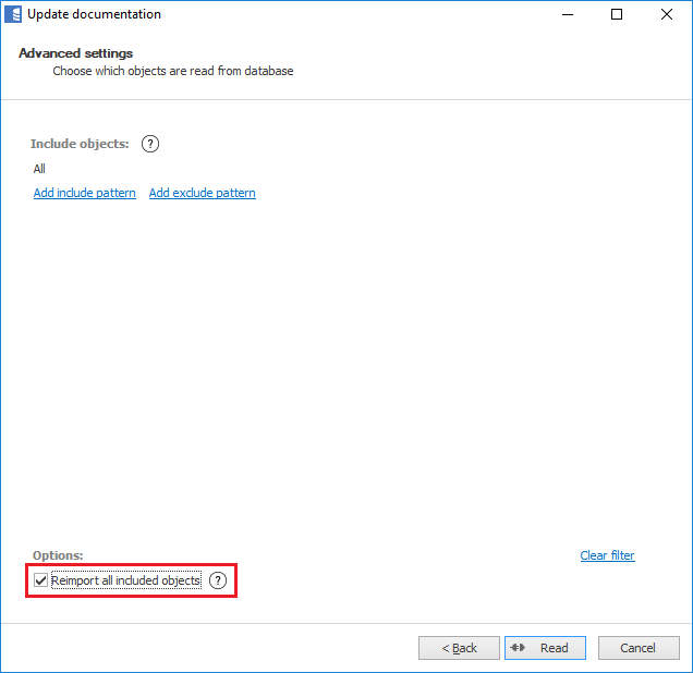 If you already have imported database schema to the repository you can add classification fields almost the same way as you would add new database (see section above) with one difference - you need to select Reimport all included objects option on the third screen of the wizard.