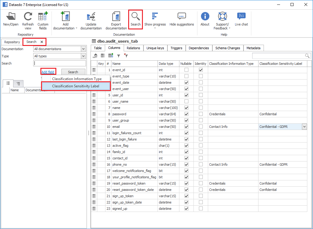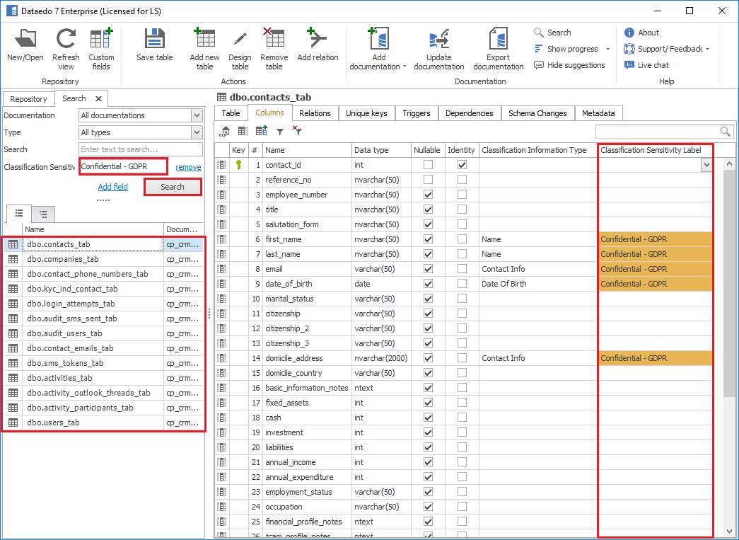 Type in value (or part of it) you are looking for and click Search. Dataedo will list tables that contain specific classification. By selecting them you can browse their columns and fields that match criteria are highlighted with orange.