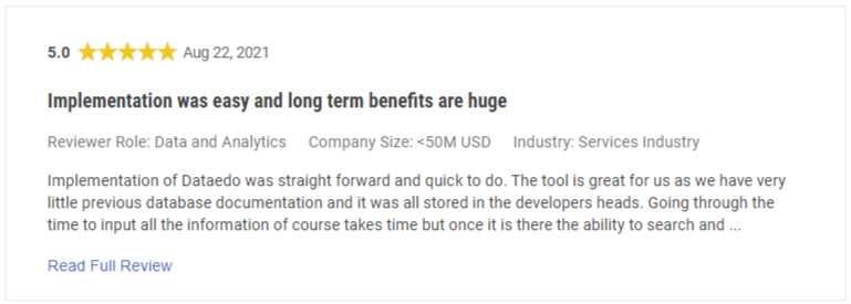 Our customers even mention in their reviews how easy it is to set up Dataedo: